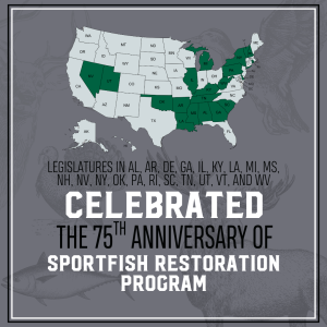Legislatures in AL, AR, DE, GA, IL, KY, LA, MS, NH, NV, NY, OK, PA, RI, SC, TN, UT, VT, and WV celebrated the 75th anniversary of the Sportfish Restoration Program and formally recognized the crucial role that sportsmen and women play in funding conservation efforts through the “user pays, public benefits” structure of the American System of Conservation Funding.